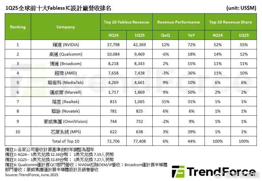 2025Q1全球十大IC設計廠商:英偉達穩居第一,豪威第九!